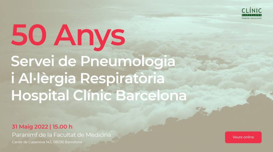 El martes 31 de mayo, a las 15h, se celebran los 50 años del Servicio de Neumología y Alergia respiratoria. En el acto se repasarán los inicios del servicio, el crecimiento y los planes futuros de la neumología en el Hospital Clínic.