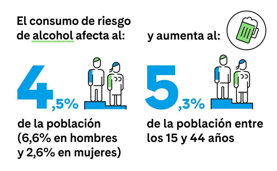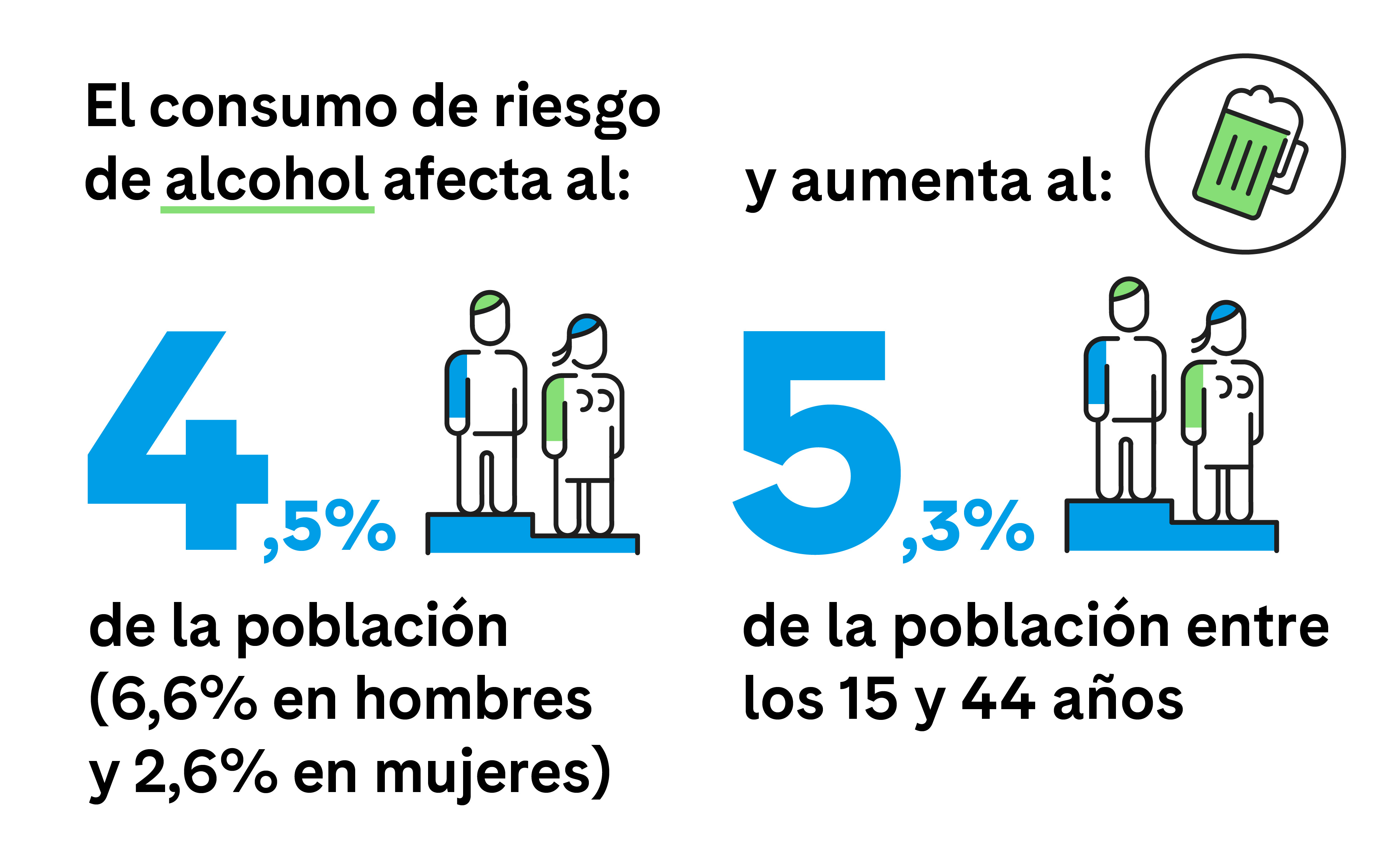 El consumo de riesgo de alcohol afecta al 4,5% de la población (6,6% en hombres y 2,6% en mujeres). Este consumo es más elevado entre los 15 y 44 años, con un 5,3%, manteniendo una tendencia estable.