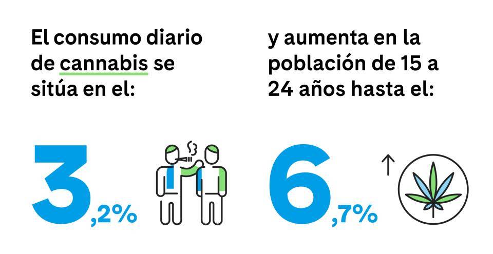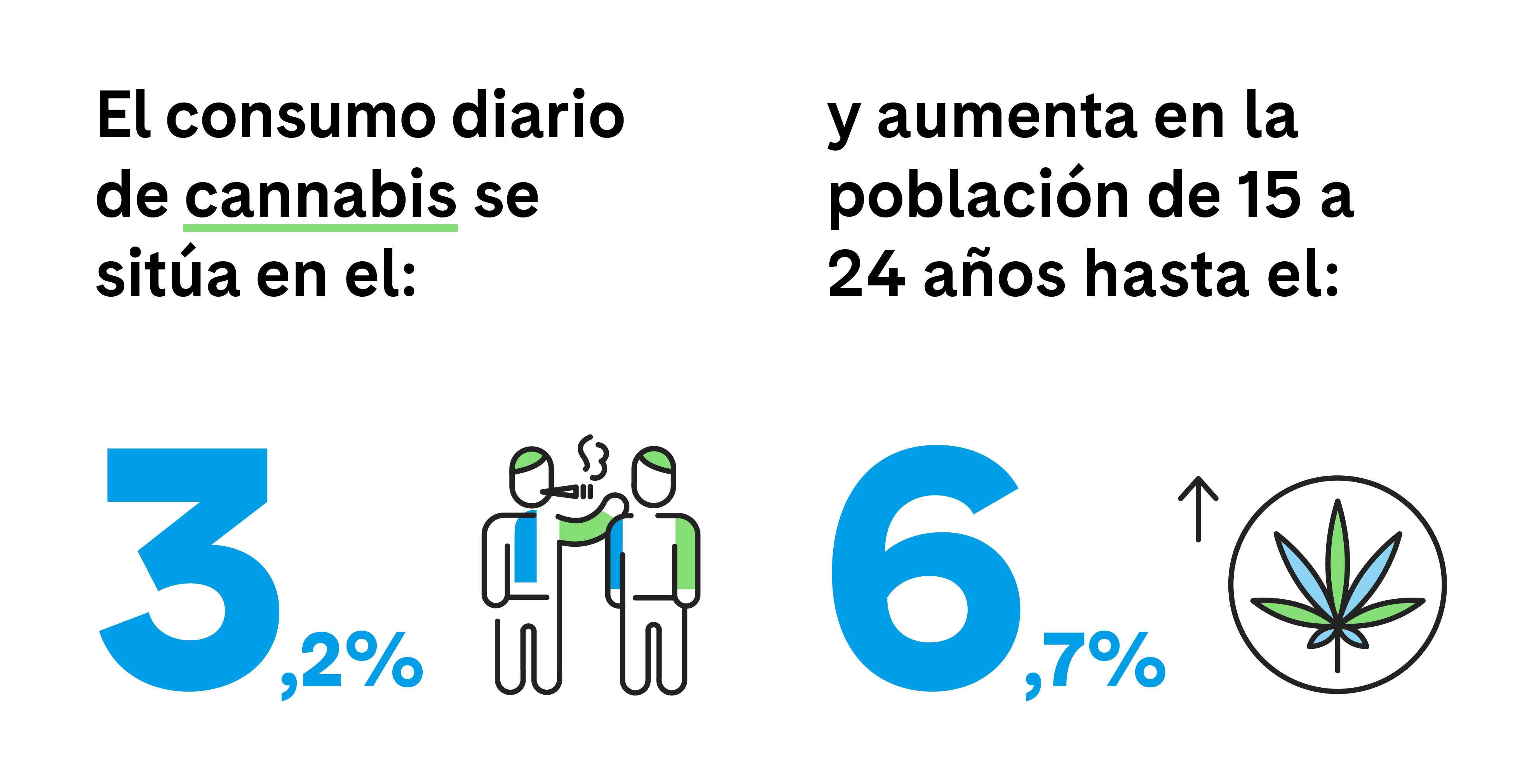 El consumo diario de cannabis se sitúa en el 3,2%, y aumenta ligeramente entre la población joven, especialmente entre los hombres jóvenes de 15 a 24 años, donde llega hasta el 6,7%.