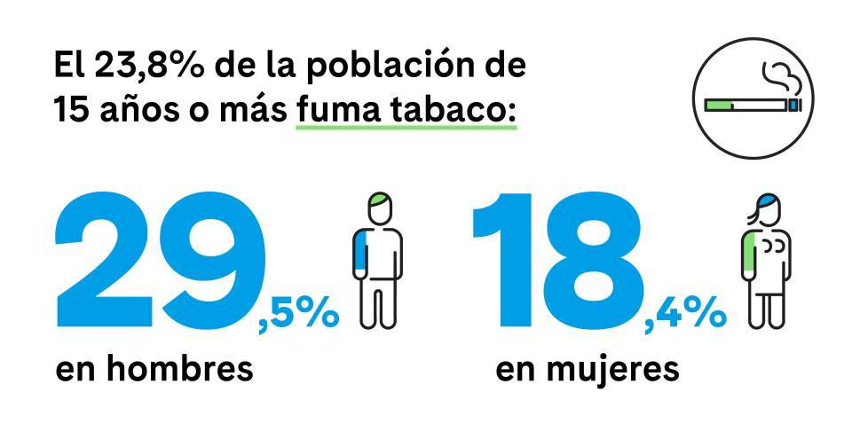 El 23,8% de la población de 15 años o más fuma tabaco (29,5% en hombres y 18,4% en mujeres). Además, el 7,4% está expuesto al humo ambiental de tabaco en el domicilio.