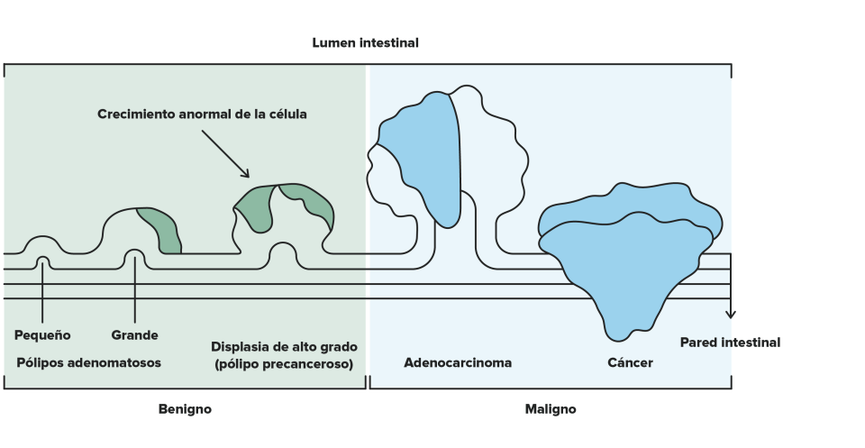 Dentro de los adenomas, se distinguen entre los de bajo riesgo y los de alto riesgo, en función de la probabilidad de progresión a cáncer. Los factores que condicionan este riesgo de progresión son el número de pólipos (más elevado cuando son 3 o más), su tamaño (más elevado cuando es superior a 1 cm), y la presencia de componente velloso o displasia (anomalía en su desarrollo) de alto grado (ambas son características microscópicas evaluadas por el especialista en anatomía patológica tras la resección del pólipo). De manera similar, se consideran pólipos serrados avanzados aquellos que tienen un tamaño igual o superior a 1 cm o presentan cualquier grado de displasia.
