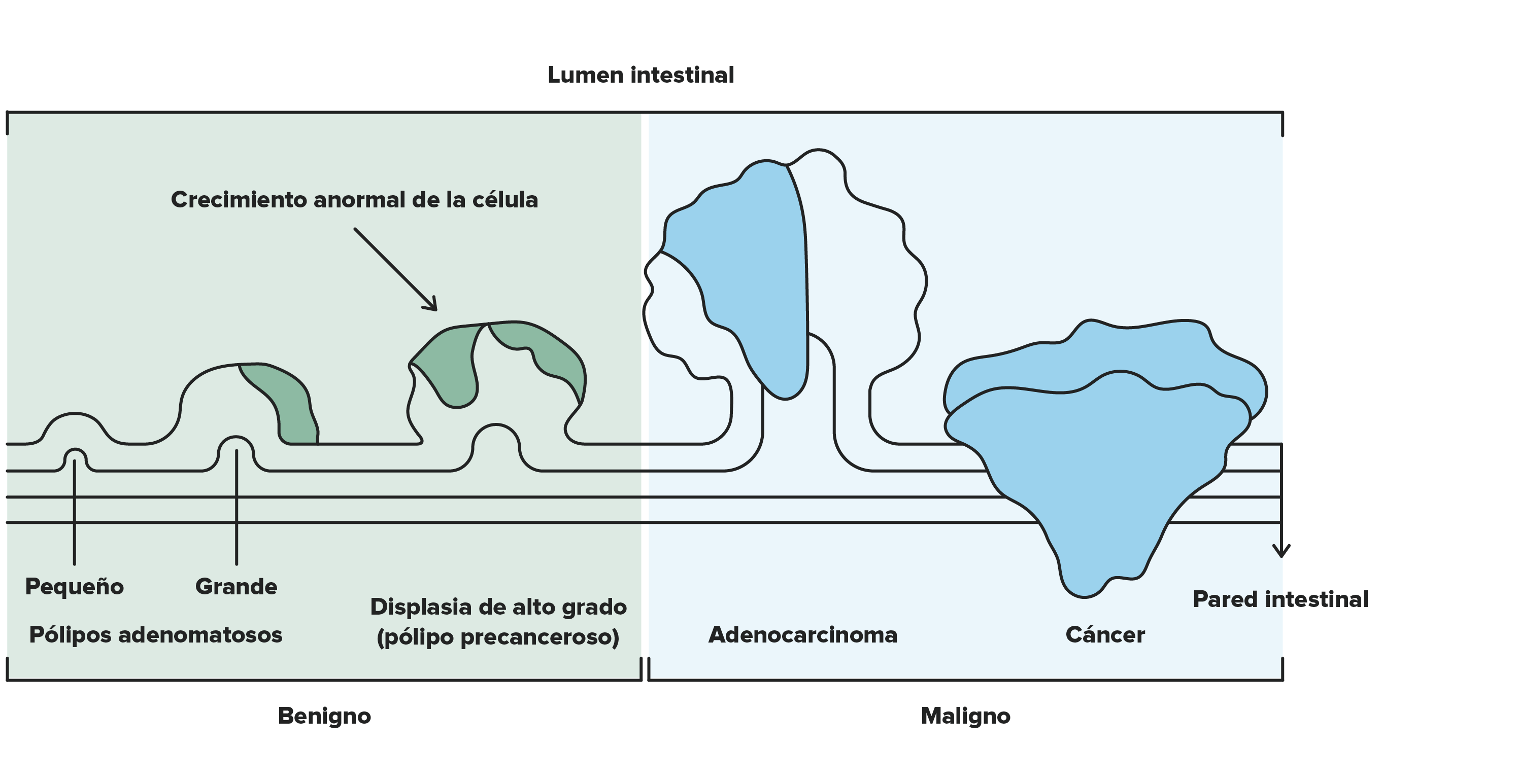La mayoría de cánceres de colon y recto se desarrollan a partir de un pólipo. Un pólipo es una masa de células que se forma y crece en los tejidos que cubren las membranas mucosas de algunas cavidades del cuerpo.