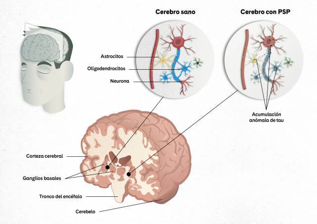 Actualmente, se sabe que este proceso está relacionado con una alteración de una proteína llamada tau, que se encuentra de manera natural en las neuronas y en las células que las apoyan. En la PSP, esta proteína se acumula de manera anómala dentro de las células, formando agregados.