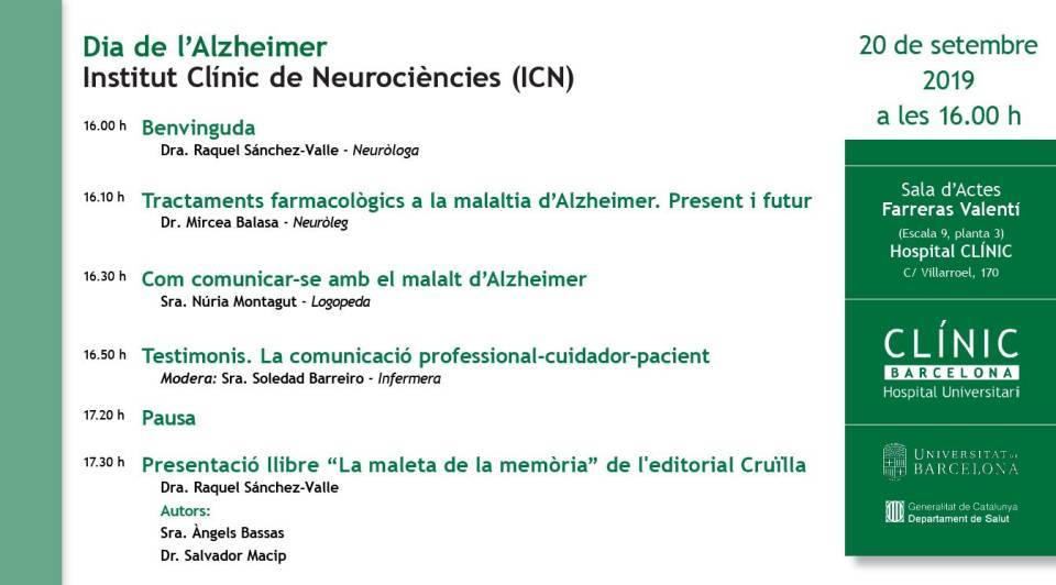 Amb motiu del Día Mundial de l'Alzheimer, l'Institut Clínic de Neurociències (ICN) ha organitzat una jornada per a pacients i familiars. Serà el 20 de setembre a les 12:00 h a la Sala d'Actes del Clínic.
