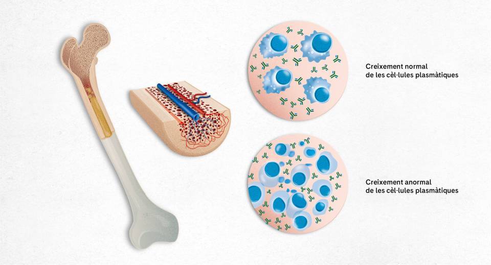 La malaltia en el mieloma múltiple es localitza a la medul·la òssia. La medul·la òssia és el teixit esponjós i tou que es troba dintre dels ossos llargs i plans del cos com el maluc, l’estern, les costelles i el crani. Està formada per cèl·lules immadures, conegudes com cèl·lules mare hematopoètiques o progenitors hematopoètics, que tenen la capacitat d’auto regenerar-se, és a dir, de produir més cèl·lules mare i dividir-se per a crear diferents cèl·lules en el torrent sanguini (hematopoesi): glòbuls rojos, glòbuls blancs i plaquetes.