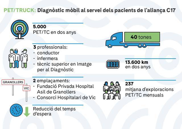 El camió pesa 40 tones i té de dues sales d’administració de dosis i una altra sala amb el PET/TC per a l’adquisició de les imatges. Formen part del dispositiu tres professionals: conductor, tècnic superior d’imatge i infermera. Per al pacient, el procés que dura una hora i mitja: una hora per a l’administració del radiofàrmac i esperar la seva distribució per l’organisme i uns 20 minuts per la presa de les imatges del PET/TC.