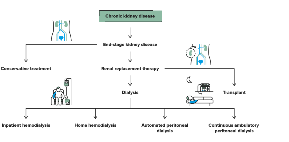 The first decision involves the choice between treatments that fulfil some renal functions (renal replacement therapy) or treatments that manage the symptoms of kidney disease (conservative treatment).