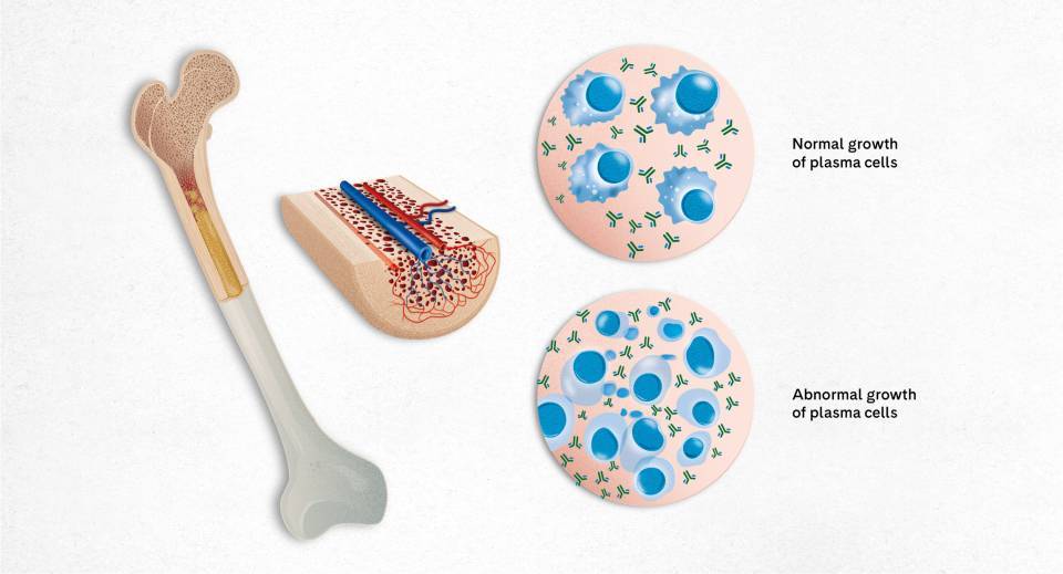 Multiple myeloma is a kind of blood cancer that develops in the bone marrow where plasma cells (a type of white blood cell) are found. The normal function of plasma cells is to synthesise proteins known as antibodies which help fight off infectious diseases. In multiple myeloma, however, plasma cells undergo abnormal growth and form tumours in different areas of the bones.