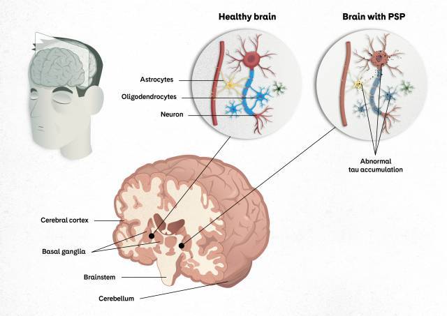 Research has shown that this process is linked to a protein called tau, which is normally found in neurons and the cells that support them. In PSP, tau builds up abnormally inside the cells, forming clumps.