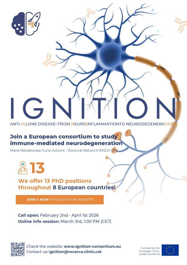 IGNITION brings together a transnational and interdisciplinary consortium of 10 host institutions in 8 European countries (Spain, Portugal, France, Italy, Germany, the Netherlands, Austria, and Poland). The project fosters the training of a new generation of researchers in neuroimmunology and neurodegeneration through innovative projects, international mobility, and advanced training. The recruitment process offers 13 predoctoral contracts of 36 months each, two of them at IDIBAPS, fully funded by the European Union. Each predoctoral researcher will develop an individual research project and undertake at least one international research stay within the consortium.