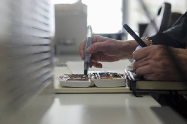 A las 11:30 comenzó el taller propiamente dicho: los grupos se distribuyeron por las diferentes plantas del CEK, acompañados de investigadores y de los tutores-Sketchers. El primer objetivo era familiarizar a los dibujantes con el entorno, descubriendo qué y cómo es un laboratorio de investigación biomédica y, para conseguirlo, los investigadores les enseñaron los diferentes espacios y les introdujeron en la investigación que realizan diariamente. Antes de empezar a dibujar, los Sketchers profesionales dieron algunos consejos sobre la mejor manera de plasmar lo que estaban viendo i sobre cómo hacerse a un espacio al que no estaban acostumbrados. Poco a poco, los cien participantes comenzaron a pasear por los laboratorios, a mirar aquí y allá... Sacaron los utensilios de sus bolsas y comenzaron a hacer los primeros trazos de lo que más les llamaba la atención -un microscopio, unas botellas, una pipeta. Todo en el más absoluto de los silencios, con un respeto por el espacio digno de admiración y con la máxima concentración para poder reproducir e interpretar sobre el papel lo que tenían delante.